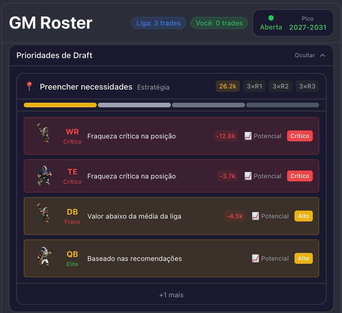 • Oportunidade: Quando um Wide Receiver assina com uma equipe que tem um QB de elite, seu potencial de Target Share e Snap Share pode disparar. Da mesma forma, um RB que era “reserva de luxo” e se torna o titular absoluto em uma nova equipe vê seu valor bruto (0-10.000) saltar no dashboard.