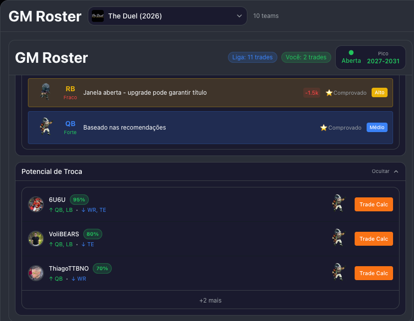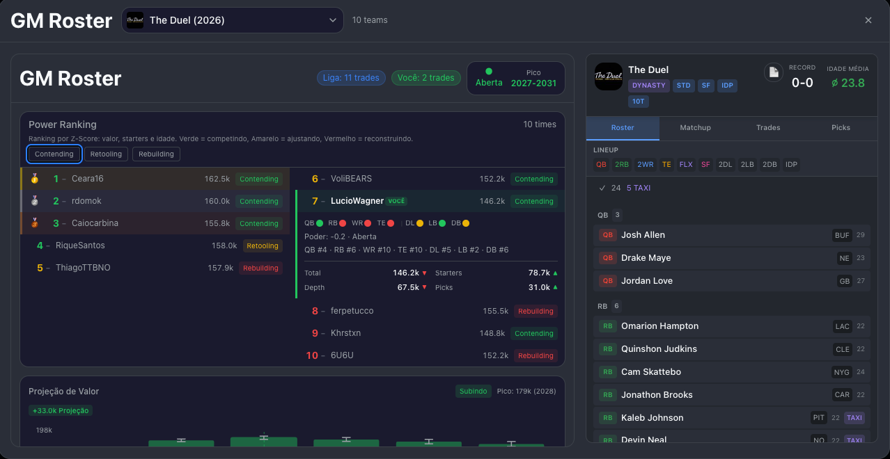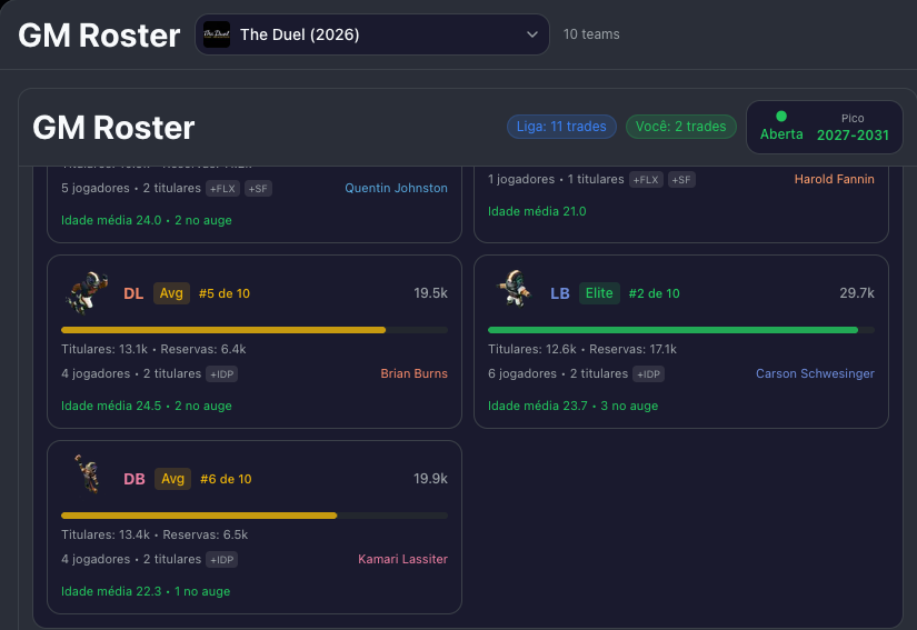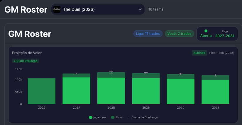 E mais: o sistema projeta quantos anos sua janela ainda vai durar, simulando o declínio de cada jogador ano a ano com base nas curvas de idade do Dynasty Pulse.