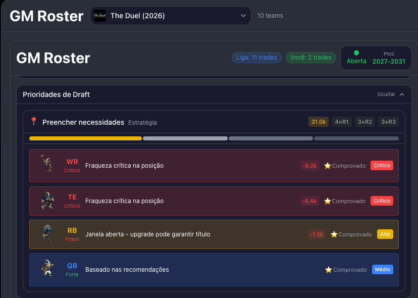 Cada posição do seu roster recebe uma classificação: Elite, Forte, Média, Fraca ou Crítica. Isso mostra exatamente onde estão os buracos do seu elenco e onde você está acima da concorrência.